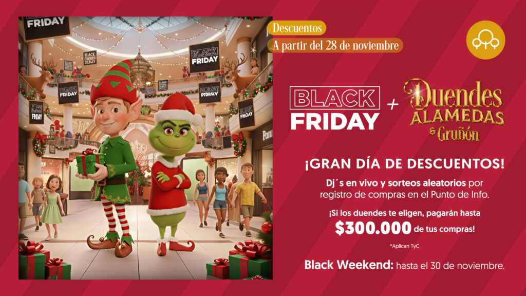 El viernes 28 de noviembre de 2025, durante el Black Friday, LOS DUENDES ALAMEDAS + GRUÑON estarán recorriendo el centro comercial para sorprender a los clientes. Durante su recorrido, visitarán diferentes locales comerciales de forma aleatoria y, cuando lleguen a la caja registradora, dirán:” ¡Alto aquí, pagaremos hasta 300 mil del valor de la factura!”  asumiendo hasta $300.000 (TRESCIENTOS MIL PESOS) del valor de la factura de las compras del cliente seleccionado.